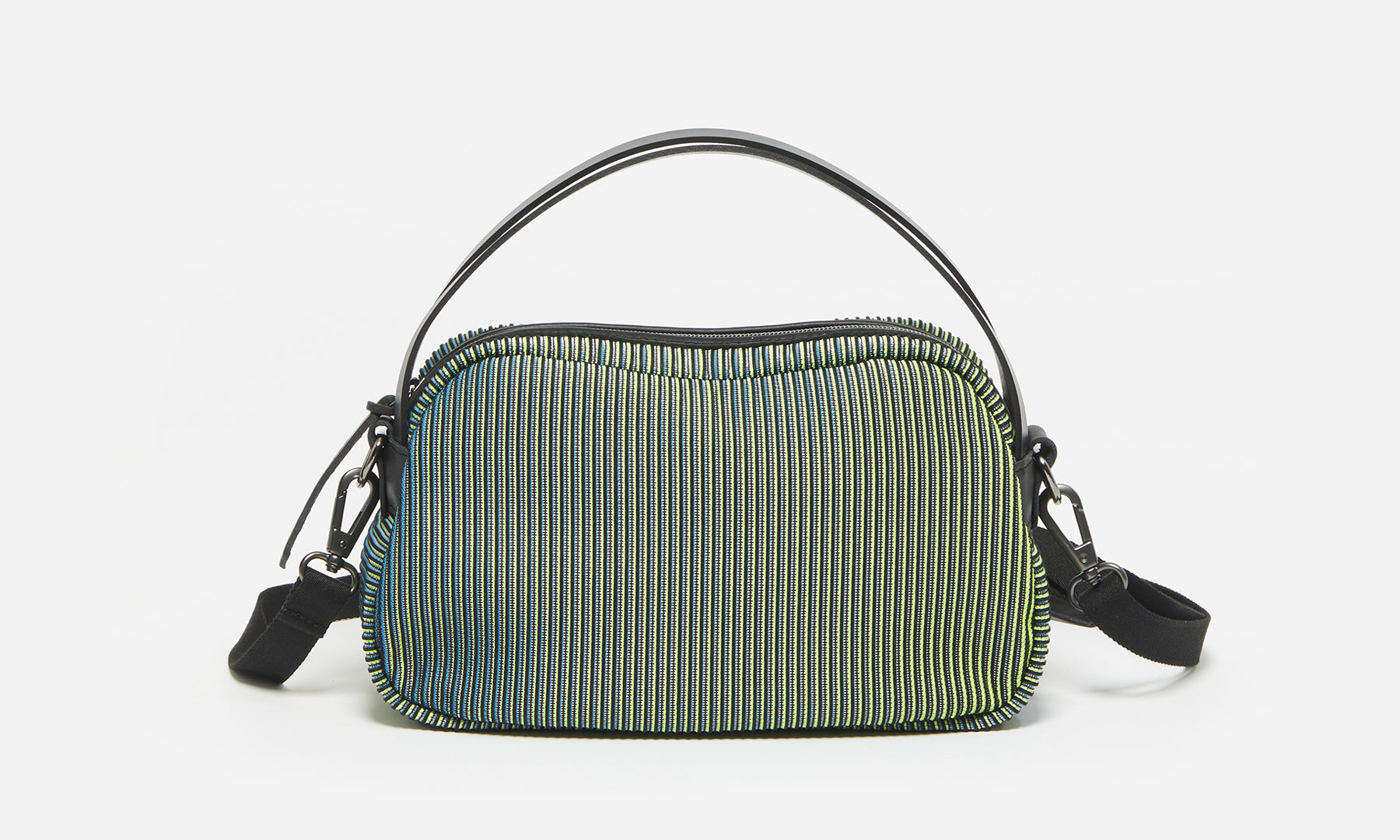 NOVA NEON: A Japanese ribbed jersey exclusive to the brand, distinguished by its three-dimensional construction and vibrant effect. Two colors: citrus, a neon green that transforms into turquoise blue, and indigo, which goes from navy blue to violet.